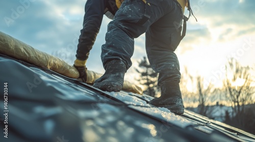 Roofing worker installing insulation under roof panels in a new house. Featuring energy efficiency and weatherproofing