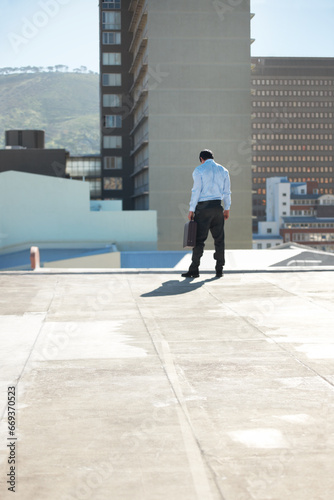 Rooftop, building and back of businessman in the city walking with briefcase in a suit. Corporate career, balcony and professional male lawyer standing outdoor on an office balcony in urban town.