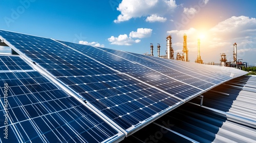 Rooftop solar panels glistening under a bright sun, symbolizing renewable energy and sustainability against an industrial backdrop.