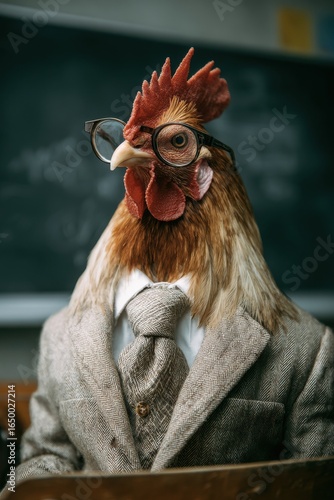 rooster, chicken, businessman, animal, dressed up, suit, attaching, goggles, funny, humorous, portrait, avian, bird, farm animal, country, rural, office, work, professional, formal, clothing, apparel, fashion, style, intelligent, smart, clever, education, teacher, prof, blackboard, school, business, career, boss, executive, corporate, manager, leader, leadership, poultry, fowl, creative, concept, whimsical, quirky