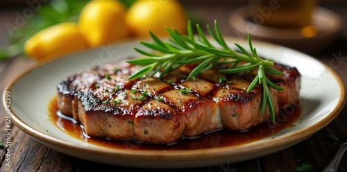 Rosemary sprig garnish for grilled steak and potato dish, fragrance, garnish, aroma