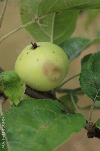 Rotten apple damaged by disease on the tree in the orchard. Apple fruit with brown spots. Fungal Disease Monilia fructigena on apple fruit