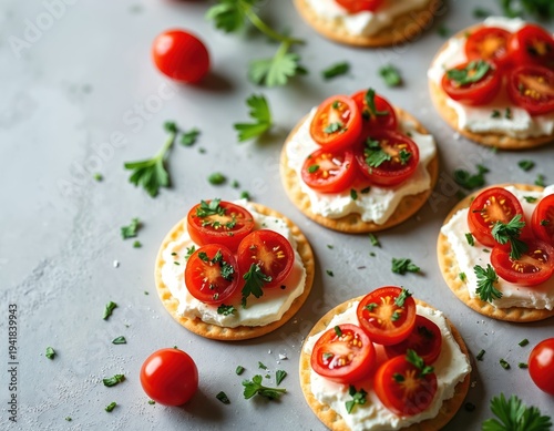 Round crackers topped with white cheese and red cherry tomato slices. Fresh green parsley garnish. Light grey surface background with scattered herbs.