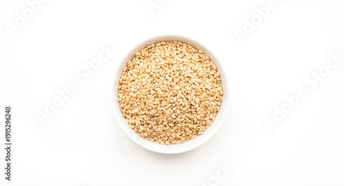 Round white bowl filled with sesame seeds placed on an all white background