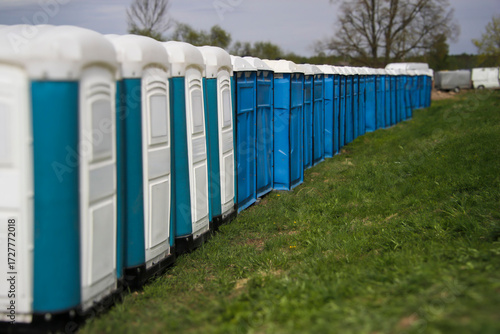 Row of Blue and White Portable Restrooms Stretched Across a Green Outdoor Field