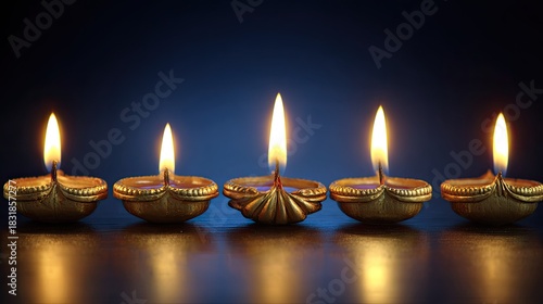 Row of five illuminated traditional oil lamps glows against a dark blue background