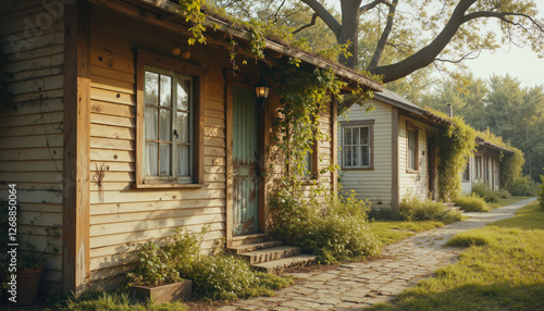 Row of rustic wooden cottages with vintage charm in a lush green countryside, featuring weathered exteriors, overgrown porches, and a quaint rural pathway