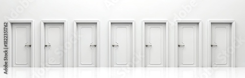 Row of white interior doors shows multiple opening states. Options represent a choice or new beginnings. Simple minimalist background suggests opportunity.