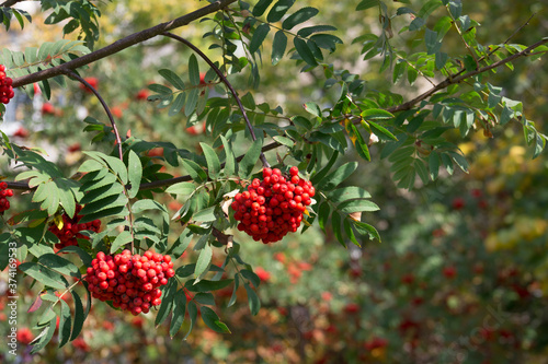 Rowan bunches with red ripe berries. Autumn sunny day.