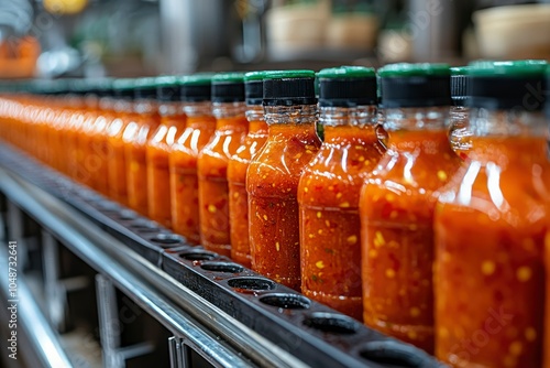 Rows of Glass Bottles Filled with Orange Sauce on a Conveyor Belt