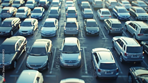 Rows of parked cars fill a large parking lot, captured in a symmetrical and orderly manner from an elevated viewpoint.