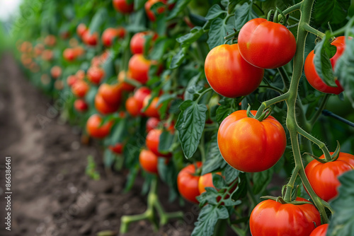 Rows of tomato plants with ripening fruit