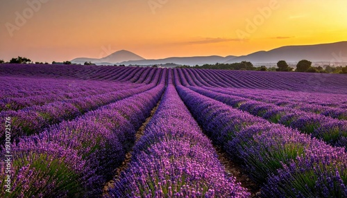 lavandula, field, purple, row, rural, agriculture, nature, landscape, summer, bloom, blossom, fragrant, aromatic, plant, cultivation, harvest, crop, scenery, serene, tranquil, peaceful, dawn, dusk, sunset, sunrise, sky, orange, yellow, horizon, mountain, hill, distant, huge, expansive, organic, floral, garden, meadow, growth, beauty, natural, scenic, country, vibrant, colours