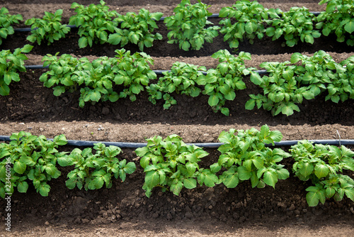 Rows of young potatoes plants and drip irrigation in the garden - selective focus, copy space