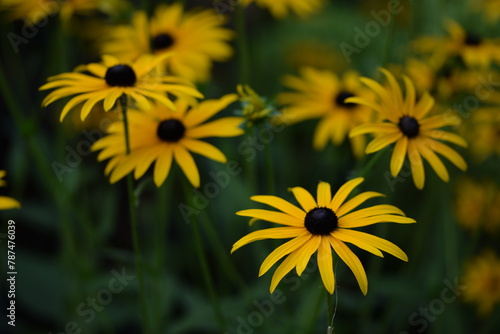 Rudbeckia blooming, yellow rudbeckia flowers closeup on bokeh flowers background, floral coneflowers background, selective focus..