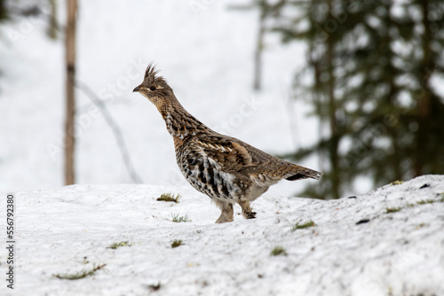 Ruffed Grouse (Bonasa umbellus) strutting across a snowbank in winter; Fairbanks, Alaska, United States of America