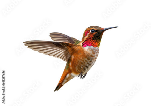 Rufous hummingbird in flight, isolated on transparent background, showcasing its vibrant orange and red plumage and delicate wings