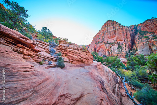 rugged, red rock, cliff, zion, national park, eye-level, utah, majestic, adventure, nature, rock, clear sky, exploration, texture, scale, desert, natural beauty, vegetation, tree, southwest, depth, solitude, travel, landscape, afternoon, pathway, outdoors, us, rock formation, morning, american southwest, shrub, geologic, sunlight