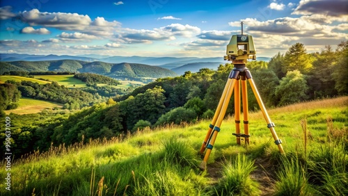Rugged terrain sprawling with dense foliage, a solitary total station instrument stands atop a grassy knoll, capturing precise land measurements amidst serene natural surroundings.
