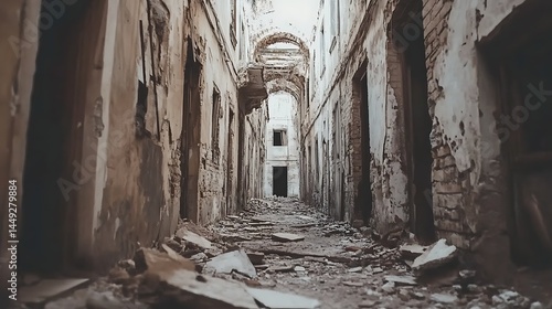 corridor, building, ruin, decay, damage, interior, crumbling, ruined, abandoned, architecture, old, deserted, grey, pale, light, stone, wall, floor, debris, broken, empty, urban decay, historical, photographic, perspective, historic building, vintage, old building