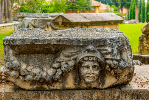 Ruins of the ancient city of Priene, Turkey. The Temple of Athena Polias in Priene an Ionic Order temple located northwest of agora, inside the sanctuary complex. It was dedicated to Athena Polias,