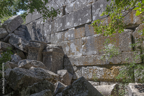 Ruins of the city of Termessos. An ancient city located high in the mountains of Turkey. The walls of the buildings in the ancient city are made of huge stone blocks. Masonry of ancient buildings.