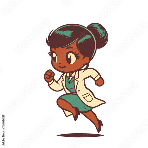 Running female doctor in a lab coat, radiating energy and determination. A dynamic and cheerful medical character illustration for healthcare branding. Isolated vector illustration