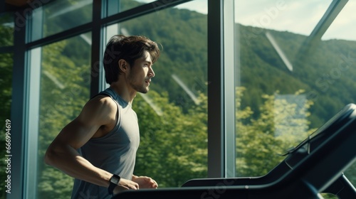 Running man practice on treadmill at the fitness.