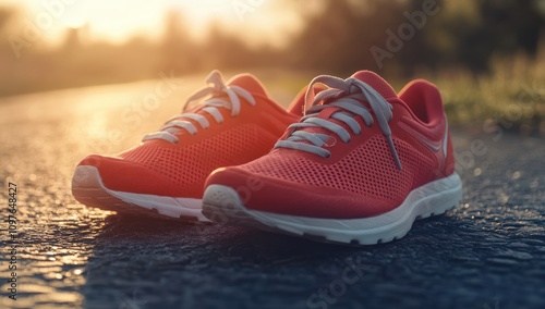 shoe, running, sneaker, sport, athletic, fitness, physical exercise, jogging, training, active, lifestyle, healthy, red, white, asphalt, road, street, track, path, ground, surface, sun, sunset, gold, hours, evening, light, warm, colours, nature, outdoors, landscape, summer, closeup, detail, sharpened, bright, photo, image, photo, visual, capture
