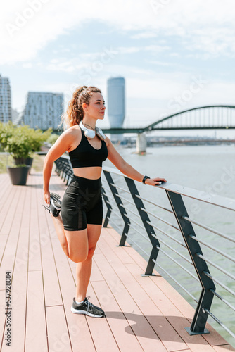 active, athletic, black, body, city, exercise, fit, fitness, girl, earphones, healthy, lifestyle, morning, outside, river, activewear, sportswoman, sporty, street, summer, training, urban, warm up, water, well-being, wellness, working out, physical exercise