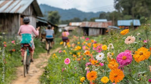Rural Cycling Through a Colorful Flower Field in a Countryside Village