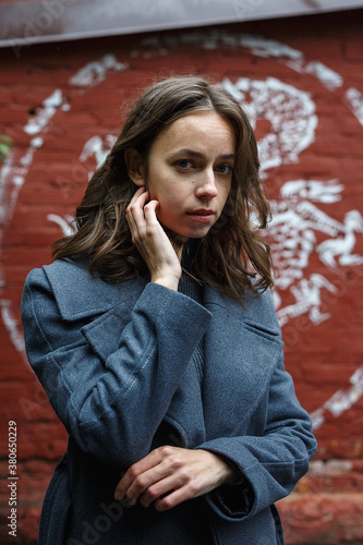 RUSSIA, MOSCOW, 10 JUN 2018: young thoughtful pretty girl in gray coat and turtleneck poses in front of red brick wall with graffiti. Street style portrait of female, urban photoshoot of elegant model