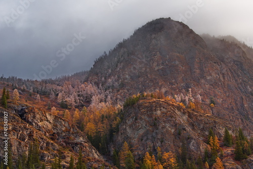 Russia. Mountain Altai. Fog turning into snow clouds around mountain peaks in the Chulyshman River valley in the south of Lake Teletskoye.