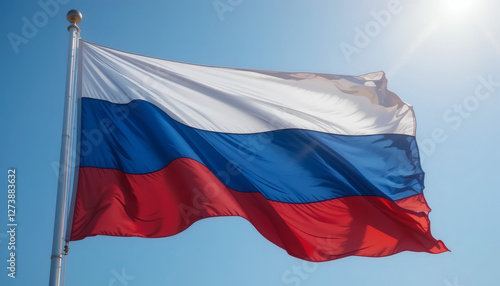 Russian flag close-up billowing in bright blue sky, vivid stripes illuminated