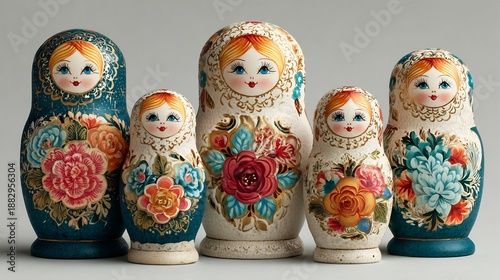 Russian Matryoshka Dolls with Floral Patterns on Gray Background