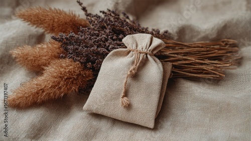 linen, drawstring, bag, pampas, grass, lavandula, dried, flower, bouquet, natural, rustic, beige, brown, neutral, decorative, home, decor, still, life, arrangement, texture, organic, nature, style, display, product, photo, retail, floral, closeup, accessory, gift, fabric, textile, design, interior, copy, space, isolated, commercial, editorial, colours, soft, hand-made, shot