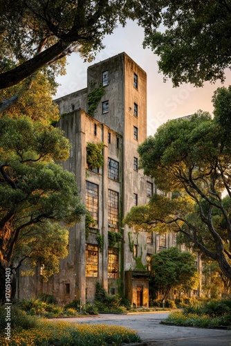 building, architecture, concrete, tree, foliage, light, gold, hours, sunset, sunrise, park, garden, path, facades, window, urban, vintage, historic, exterior, nature, landscape, shadow, texture, grey, green, yellow, brown, calm, still, detailed, perspective, structure, day, outside, toned, design, view, image, photo, parkway, ivy, overgrown