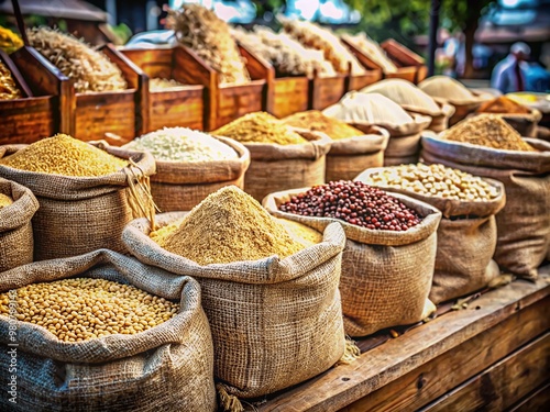 Rustic burlap sacks overflowing with ancient grains, including quinoa, Kamut, and spelt, sit atop a worn wooden crate at a bustling outdoor farmers market.