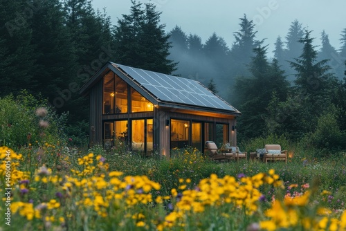 cabin, rustic, house, wooden, forest, flower, yellow, twilight, light, nature, exterior, landscape, hill, green, tree, solar, panel, evening, peaceful, quiet, meadow, flora, wildflower, design, modern, simple, relaxation, calm, mountain, illuminated, structure, architecture, illumination, home, wood, summer