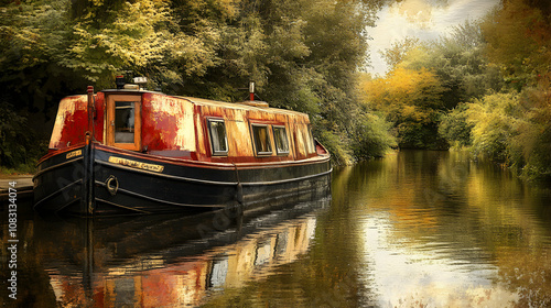 Rustic Canal Boat Docked in Autumnal Setting, Reflecting Golden Hues on Calm Water