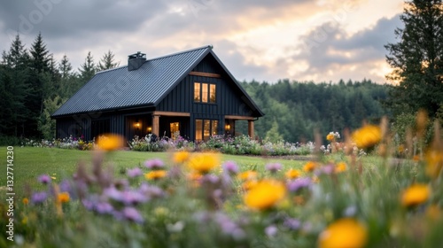 rustic farmhouse design, rustic farmhouse with reclaimed wood beams and metal roof, surrounded by wildflowers, with space for text in background