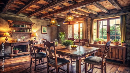 Rustic Farmhouse Dining Room Mockup: Vintage Style Interior Design Stock Photo