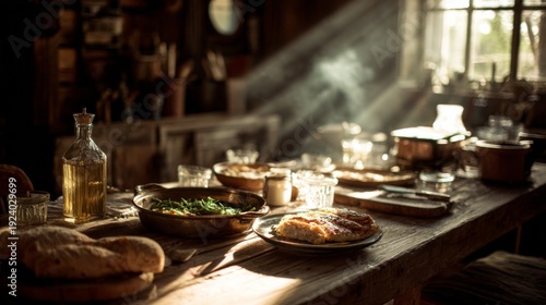 Rustic farmhouse kitchen table with homemade meal bathed in warm morning sunlight