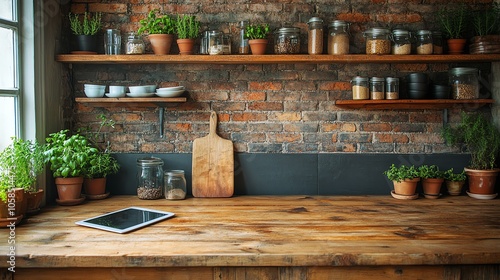 kitchen, countertop, herb, jar, brick, wall, rustic, decor, plant, wood, organic, simple, touch, light, tidy, counter, modern, cosy, surface, arrangement, greenery, kitchen utensile, invite, garden, storage, homelike, farmhouse, design, lifestyle, handcraft, minimal, element, tablet, wholesome, atmosphere, texture, ambience, nature, wooden, pottery