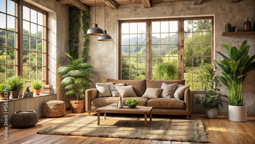 Rustic Living Room Design with Abundant Natural Light and Lush Greenery Featuring a Comfortable Sofa and Wooden Coffee Table