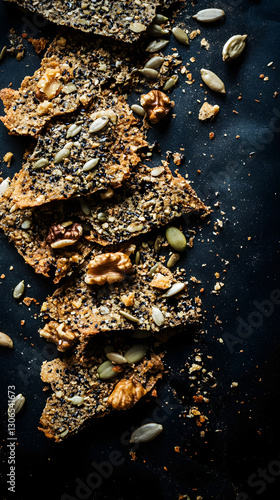 Rustic seed and nut crackers on dark background for culinary presentation. Moody style. Food vertical advertising banner. Healthy snack concept. Top view photo
