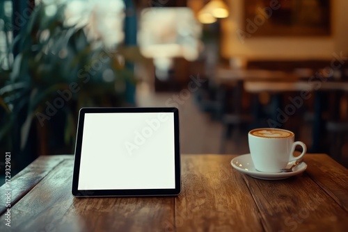 tablet, device, closeup, blank screen, wood table, cafes, cosy, blurred background, coffee cup, pastry, food, drink, warm tones, lifestyle, work, leisure, technology, digital, interior, coffee break, bakery, atmosphere, high-quality, photorealistic, copy space, background, home office, simple, modern, communication, eatery, indoor, nobody, casual attire, comfort, warm light