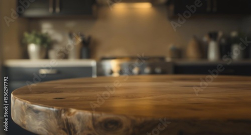 Rustic Wood Tabletop in Blurred Kitchen Scene