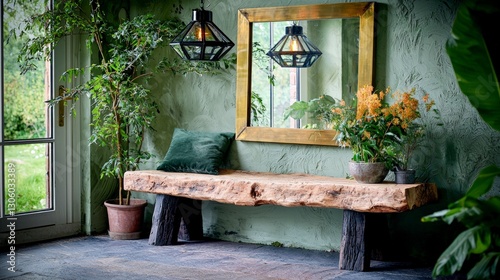 rustic, wooden, bench, antechamber, decor, mirror, brass, metal, glasses, pendant, light, plant, greenery, flower, orange, green, wall, interior, design, home, natural, wood, seating, relaxation, atmosphere, inviting, warm, style, contemporary, elegant, calm, tranquil, space