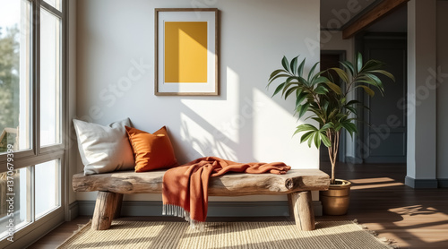 bench, wooden, rustic, pillow, blanket, off, white, sunlight, warm, cosy, texture, natural, tranquil, simple, elegant, home, decor, interior, room, living, space, comfort, relaxation, serenity, peaceful, calm, bright, light, aesthetic, style, minimalist, modern, house, apartment, furniture, sofa, sitting, area, plant, pot